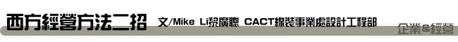 如CACT線裝優勢沒有劃分出來,我們什以產品都做,沒有自已的核心產品,大家的力量不集中,結果我們事事都做成一般般,客人來也沒什麼亮點可看,信心沒有建立起來。產品沒有競爭力,總是得不到有效的發展,這些都是因為我們沒有明確對自已作出定位並執行下去。